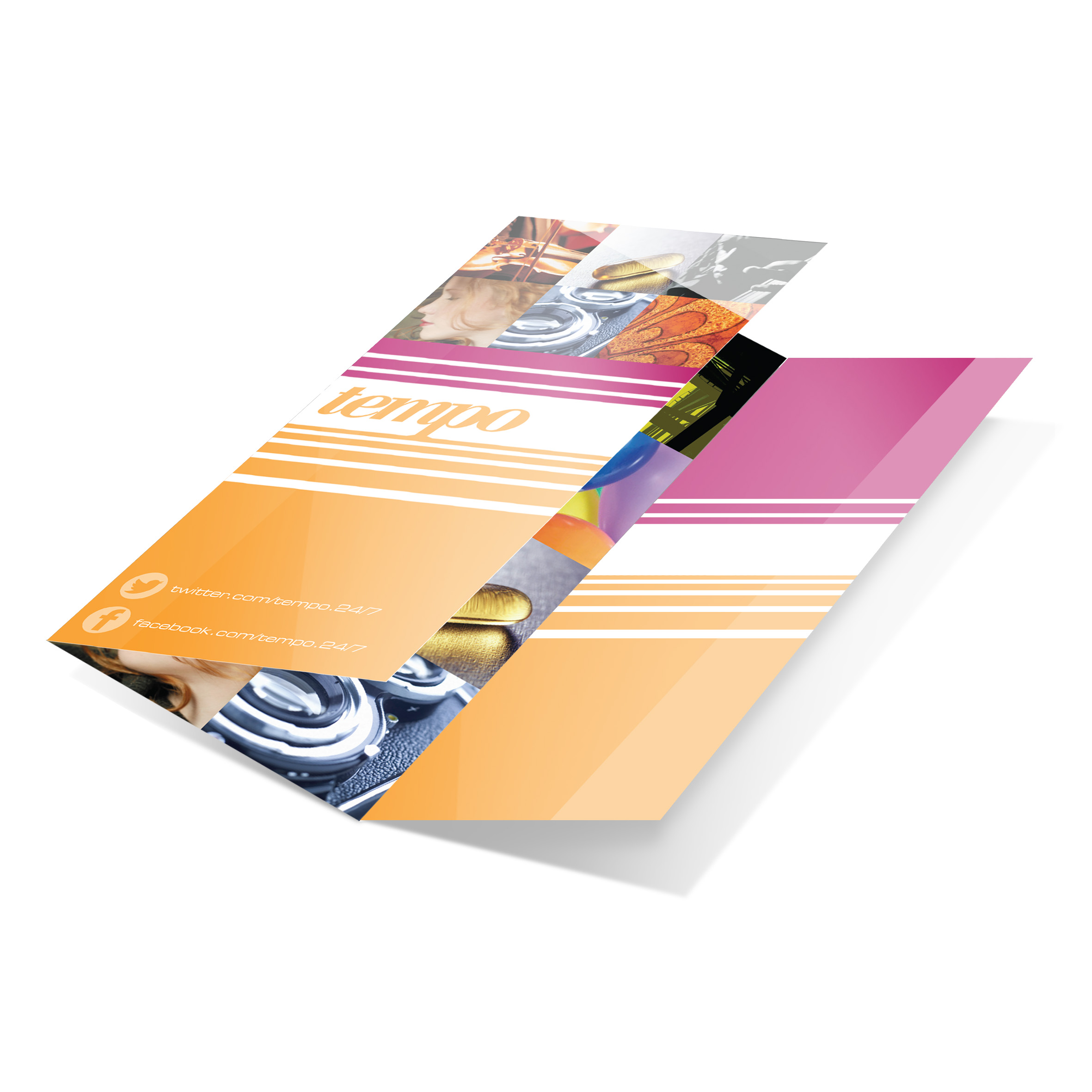 A4 flat size creased/folded to finished size A5 4pp (Half Fold - Long Edge Bound) or DL 6pp (C-Fold/Z-Fold - Long Edge Bound) printed CMYK throughout on 170gsm silk.