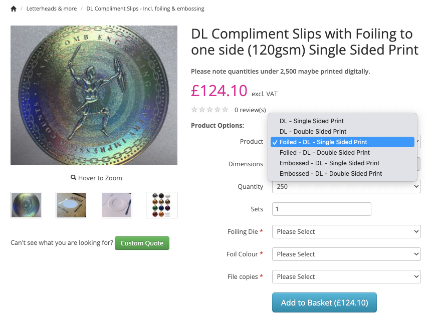 Use the ‘Product’ selector below to choose from single or double sided print, with our wide range of additional finishes that will complement your design, including, die-cutting, hot foil - 13 shades available online, 100’s available upon request and finally embossing.